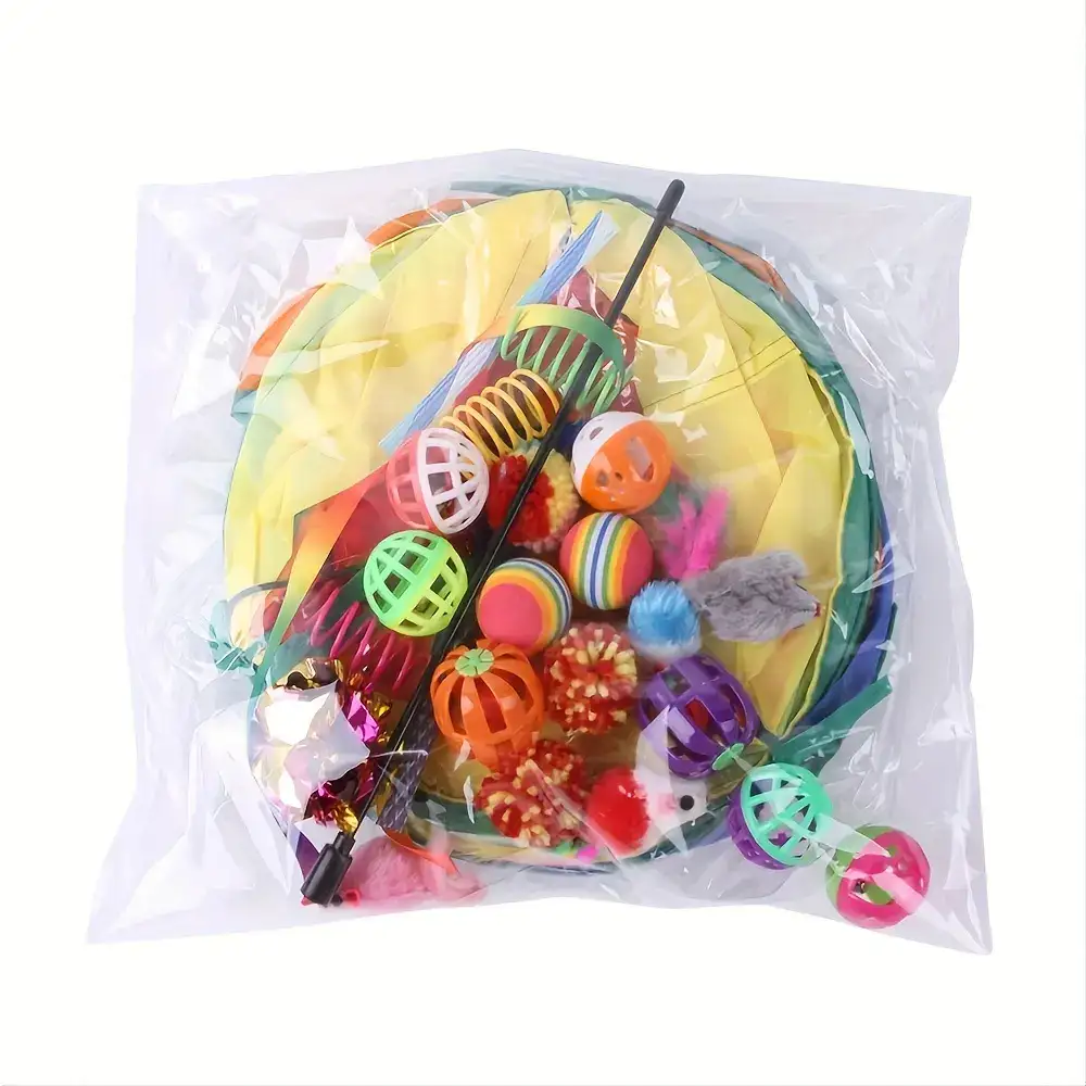 This interactive cat toy set includes a tunnel and a variety of small toys for play and activity. The assortment is designed to support batting, chasing, and pouncing behaviors during supervised use. Mixed toy shapes and textures provide different ways for cats to interact. Accessory colors may vary.
