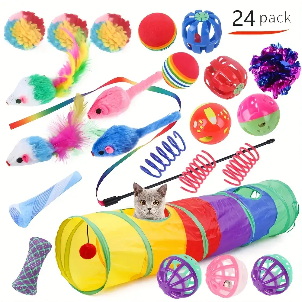 24-Piece Interactive Cat Toy Set for Play & Activity with Tunnel, Teaser Wand, Balls and Bell Toys