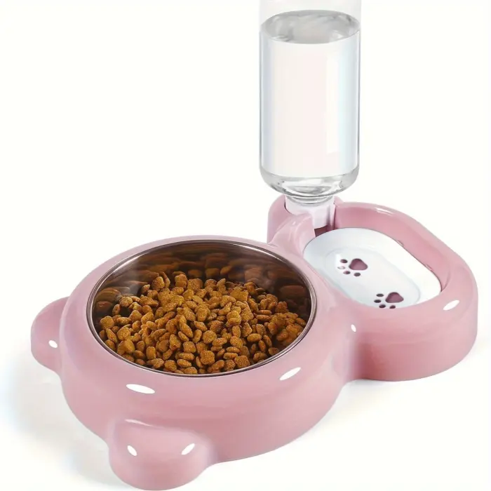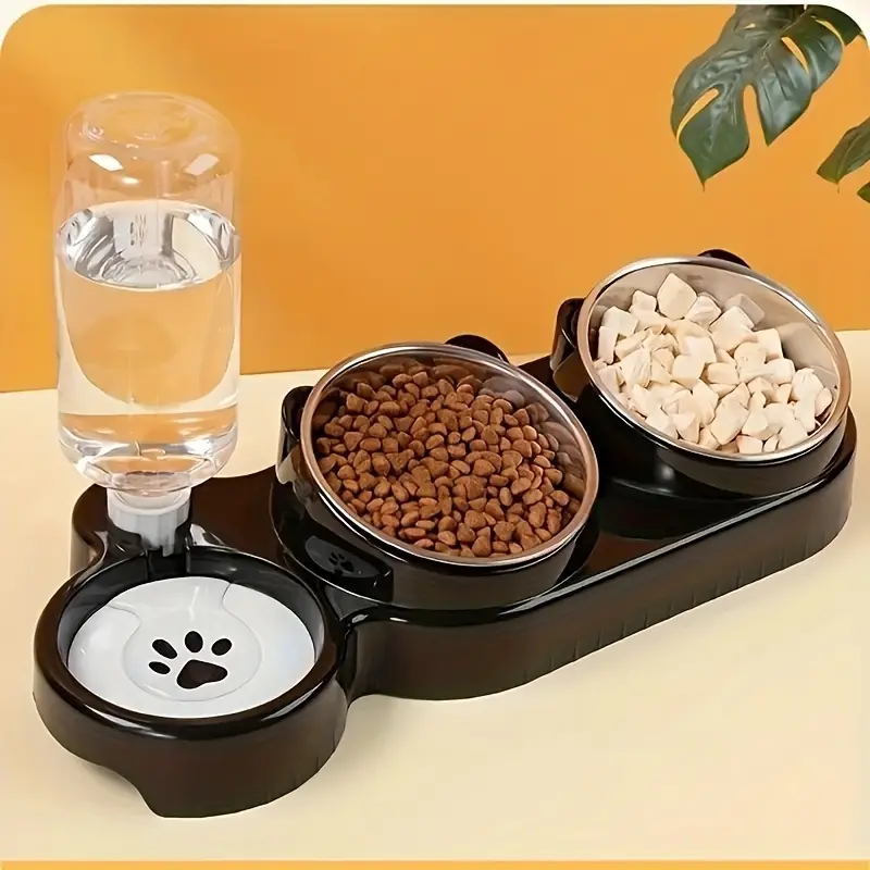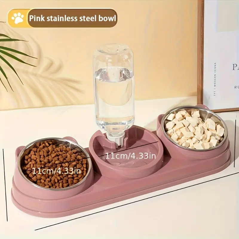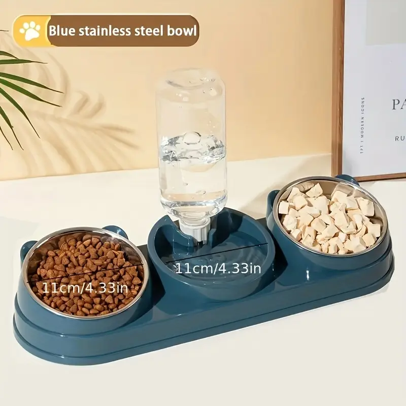 This 3-in-1 pet feeder combines a food bowl with an automatic water dispensing container for everyday feeding. The tilted bowl design is intended to support comfortable access to food and water. A non-slip base helps keep the feeder stable during use. The stainless steel bowl is designed for routine cleaning and refilling.