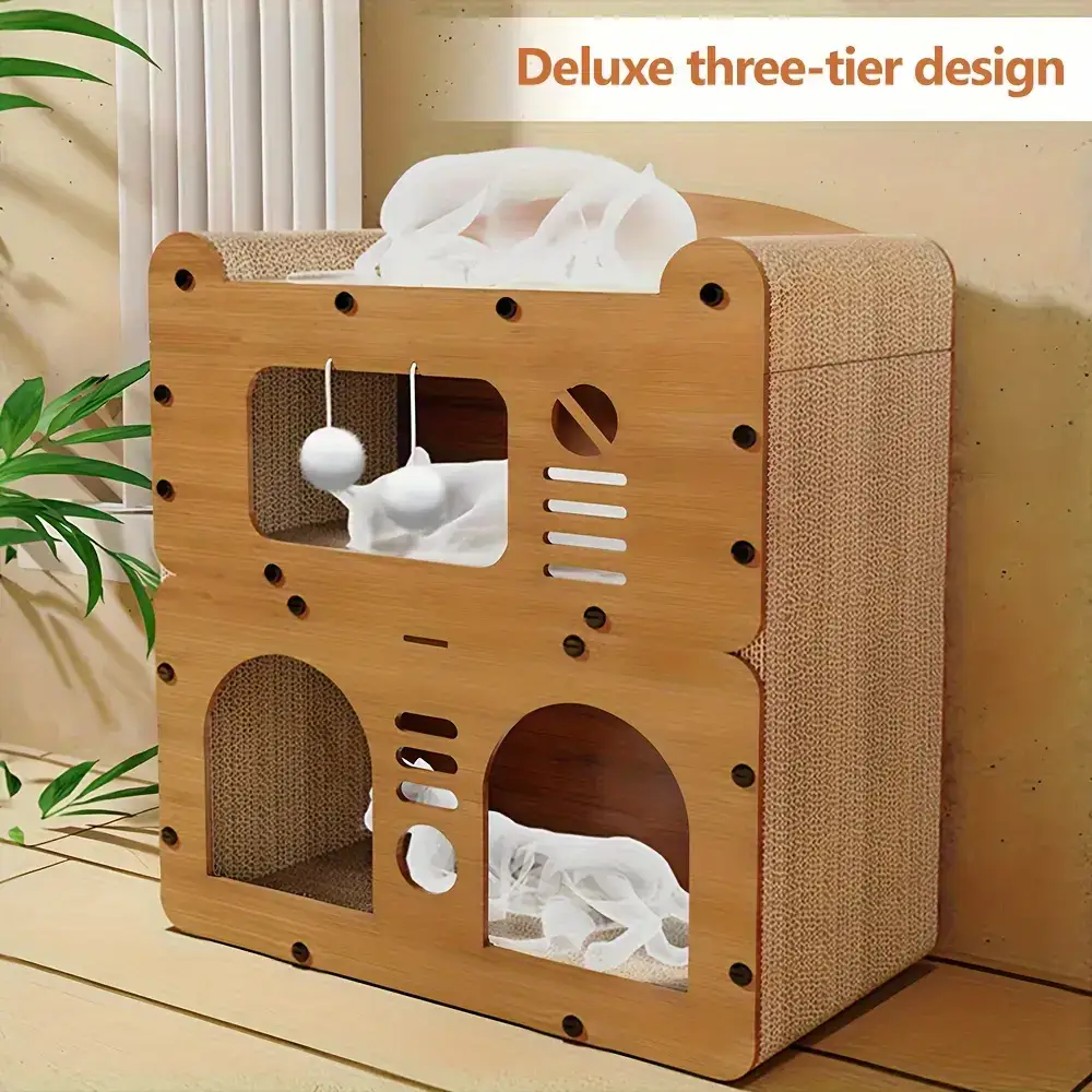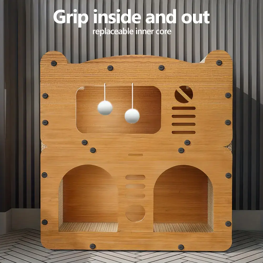 This cat house condo provides an enclosed resting area designed for cats. The structure includes ventilation doors to support airflow through the interior space. Integrated scratching boards and hanging plush balls add built-in interaction surfaces. The enclosed form factor is intended for use on indoor floor surfaces or other stable ground-level areas.