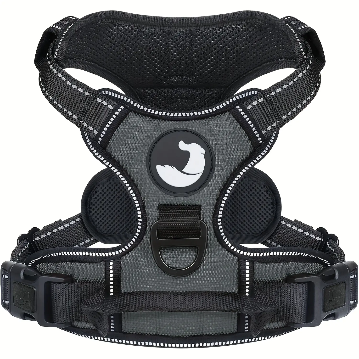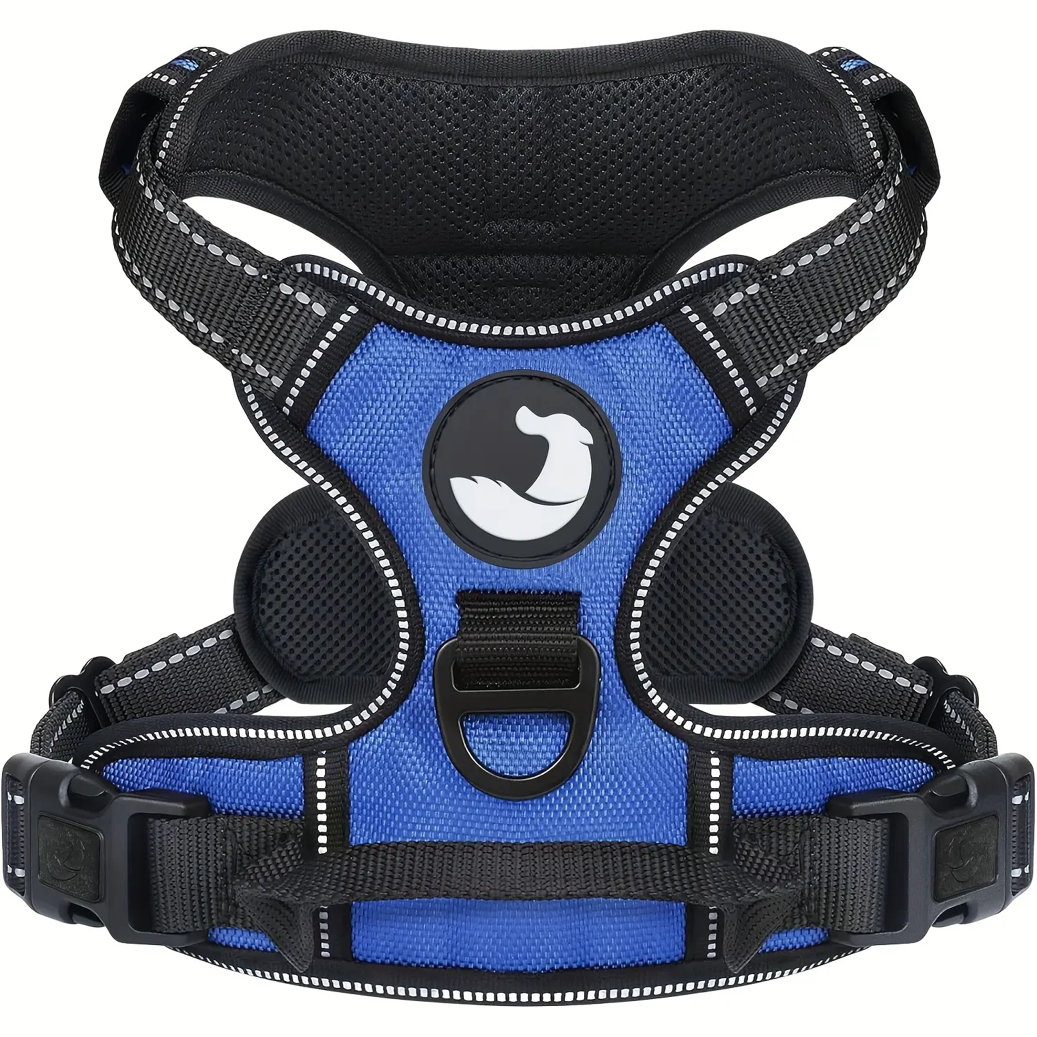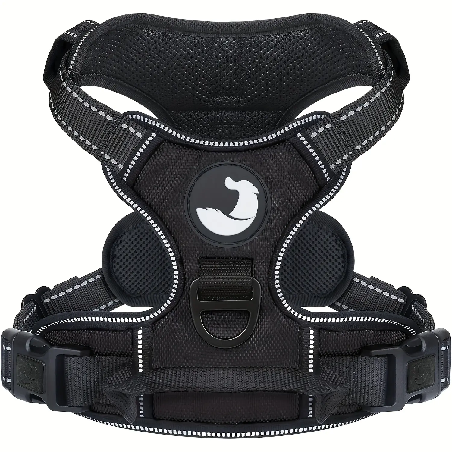 This dog harness is designed to help guide and manage a dog during training and walking. The vest-style shape includes padded sections intended to reduce pressure around the neck area. Two leash attachment points provide options for connecting a leash at the front or back. Reflective trim is included to help increase visibility in low-light conditions.