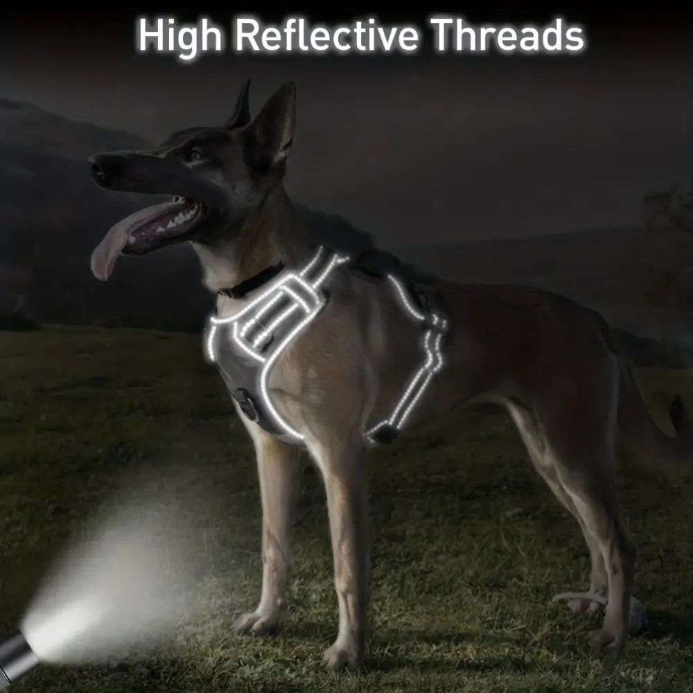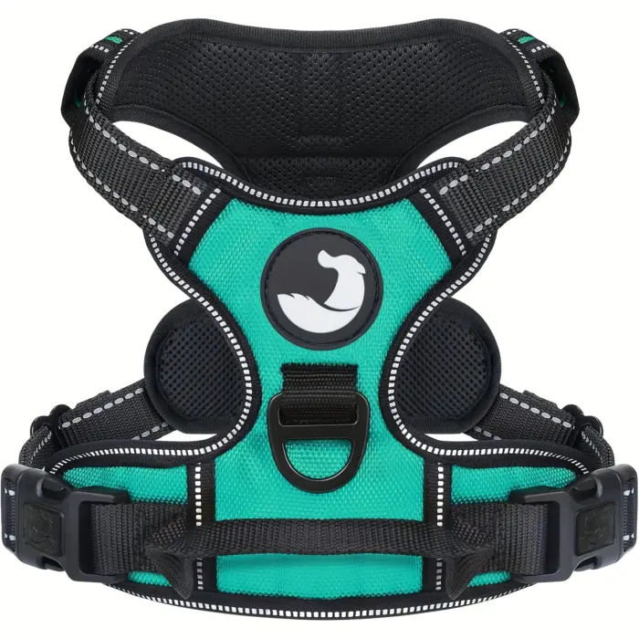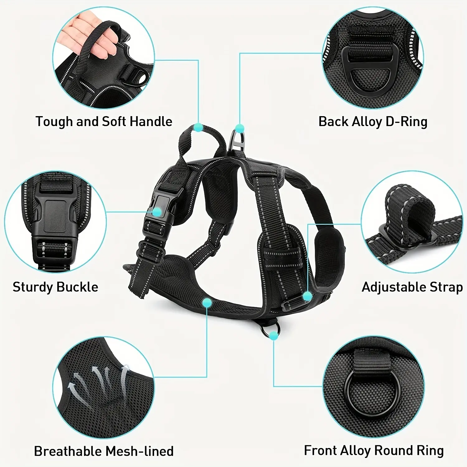 This dog harness is designed to help guide and manage a dog during training and walking. The vest-style shape includes padded sections intended to reduce pressure around the neck area. Two leash attachment points provide options for connecting a leash at the front or back. Reflective trim is included to help increase visibility in low-light conditions.