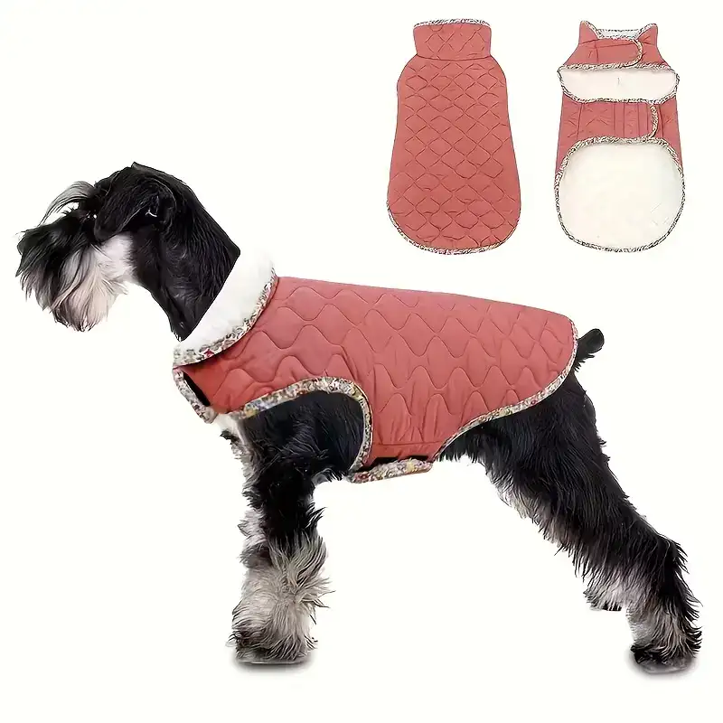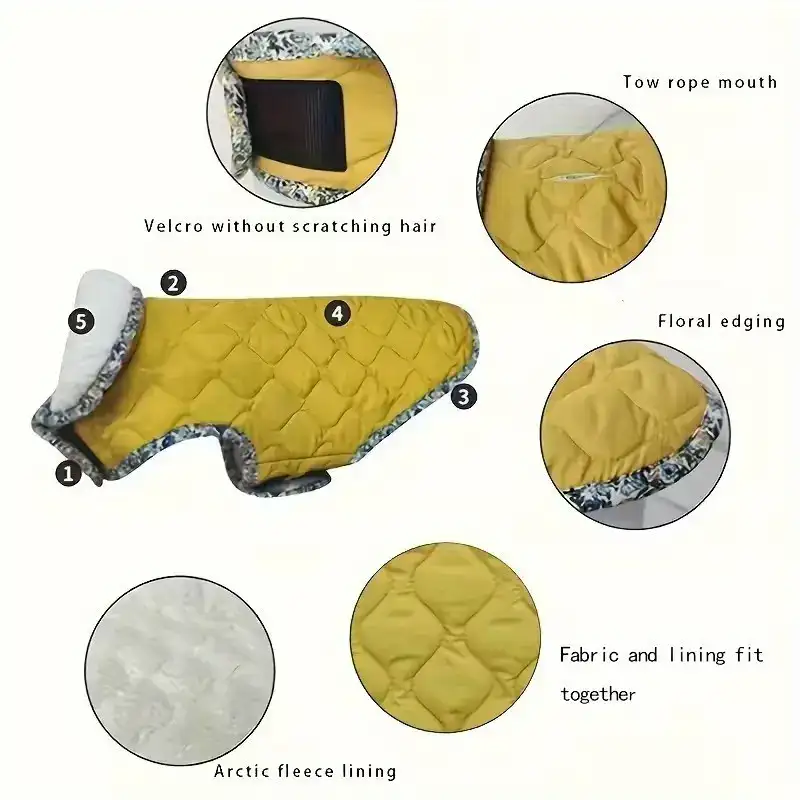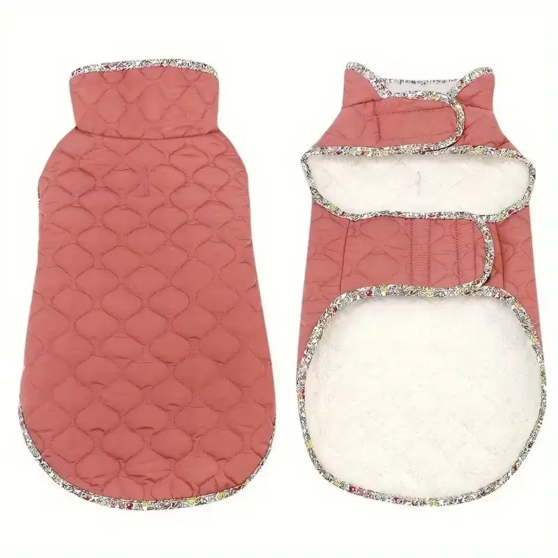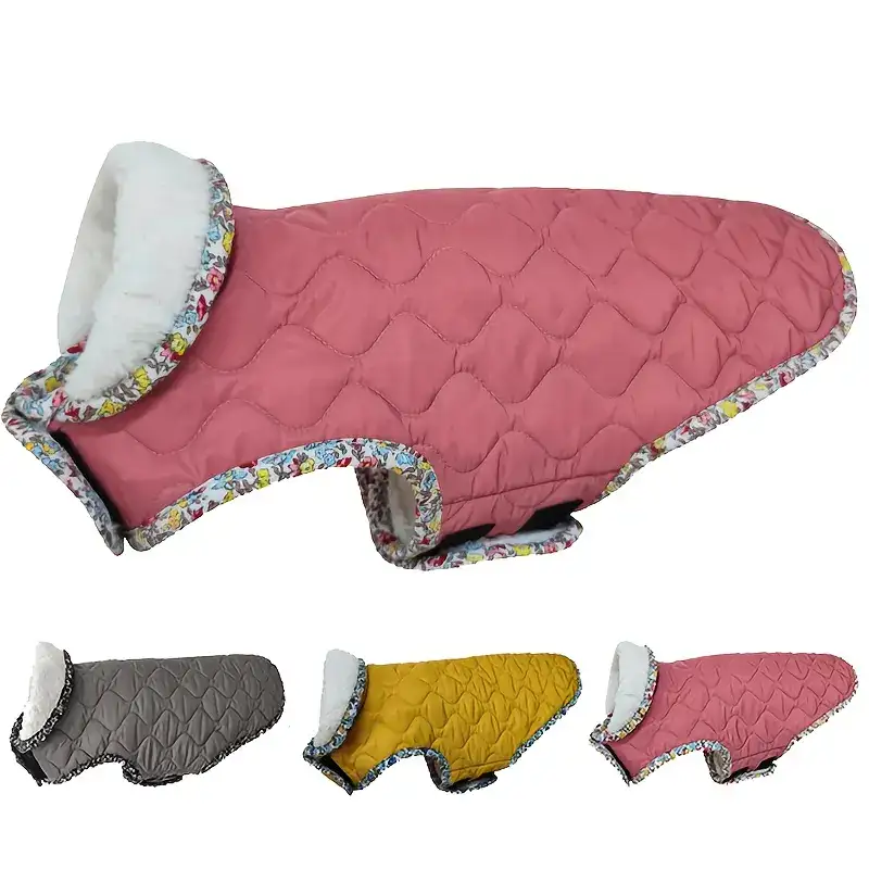 This dog jacket is designed for cold-weather wear with a padded construction and fleece lining. The outer layer is made to help resist light moisture during everyday outdoor use. An adjustable closure design helps support a secure fit across different body shapes. The jacket is intended to be easy to put on and remove for routine wear.