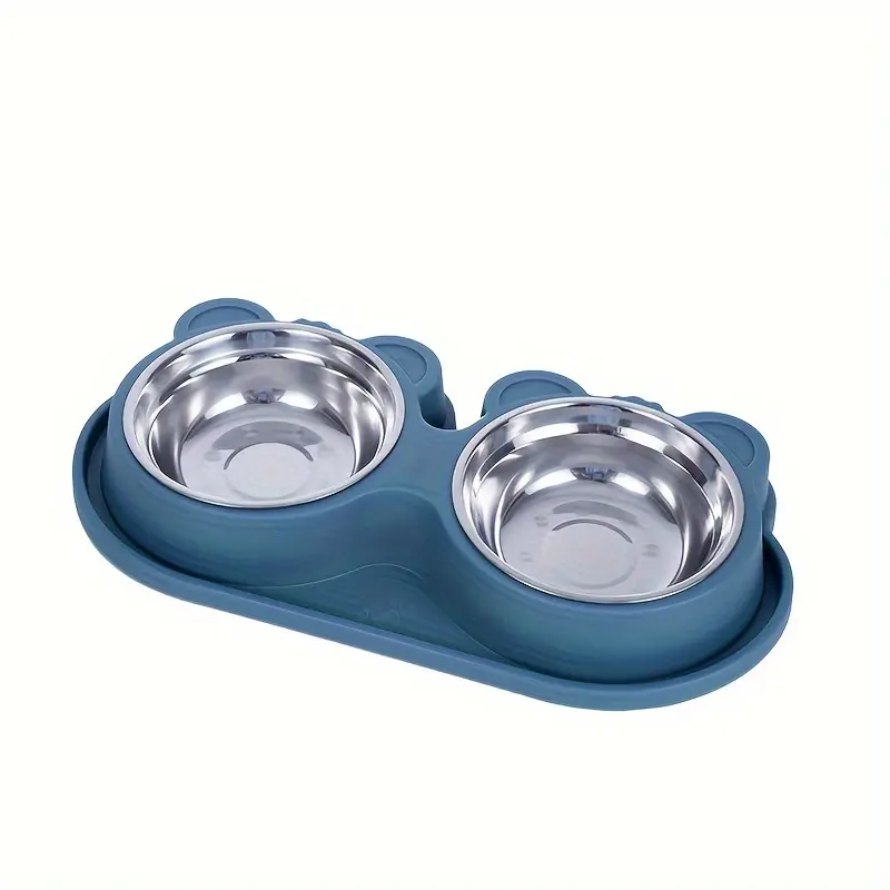 This double dog bowl set combines two stainless steel bowls with a stand designed to help reduce tipping and spills. The raised frame keeps the bowls positioned for serving food and water in one place. Stainless steel surfaces support routine rinsing and wiping between uses. The stand-and-bowl design is intended for everyday feeding setups.