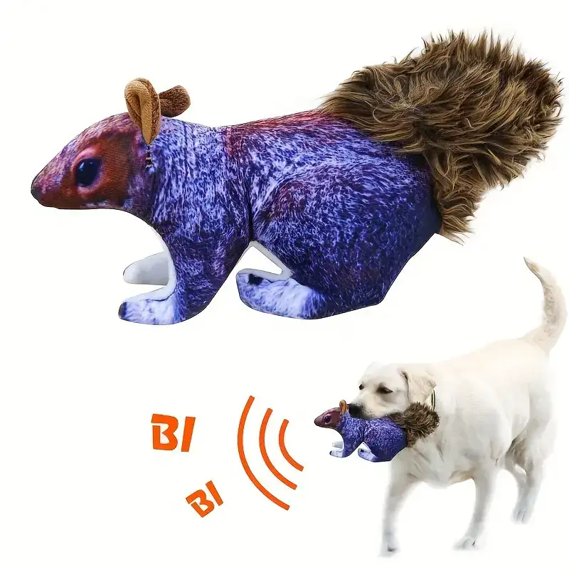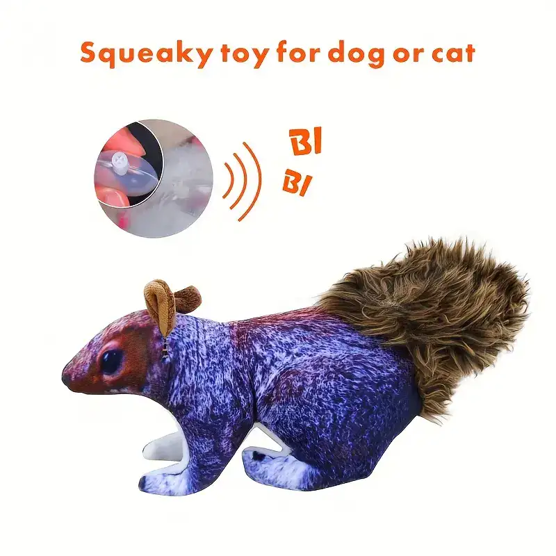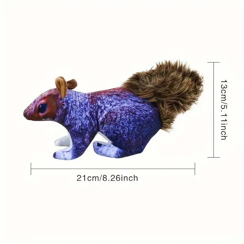 This interactive squirrel plush dog toy is designed for squeaking and fetch-style play. The polyester outer shell provides a soft feel while helping the toy hold its shape during handling. An internal squeaker adds sound-based interaction when pressed or bitten. The compact plush form is easy for many dogs to carry, toss, and retrieve. Use under supervision and replace if the toy becomes damaged.
