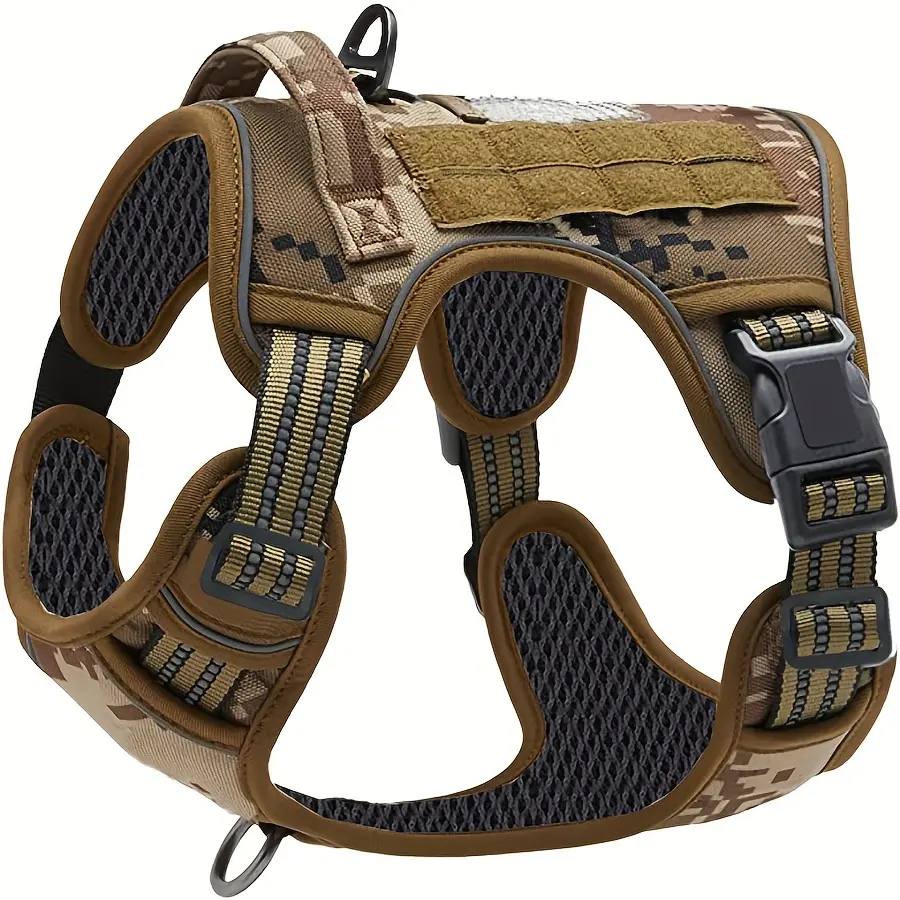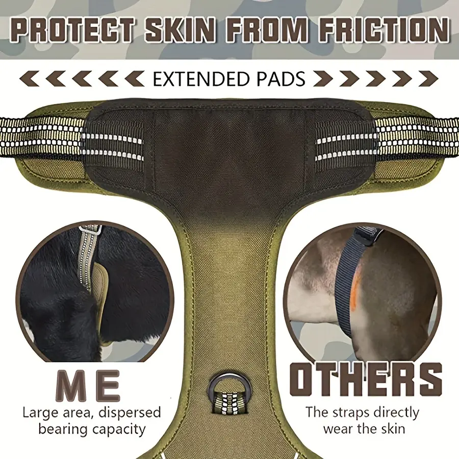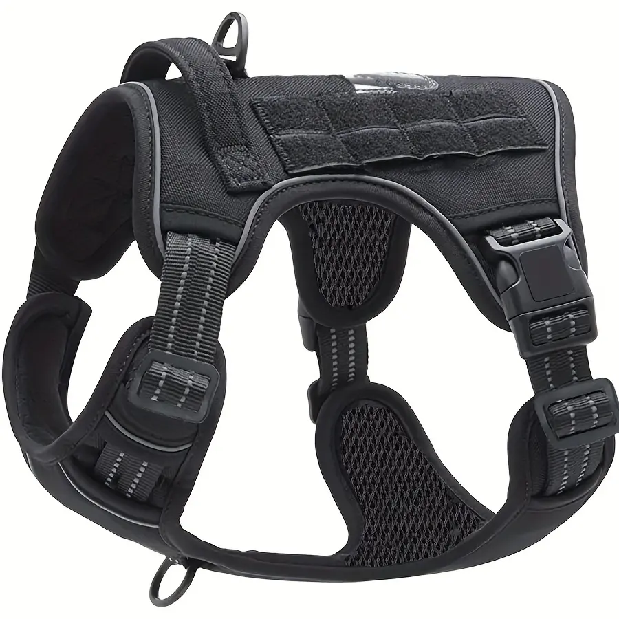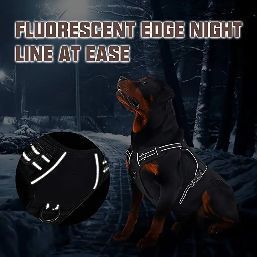 This large dog harness is designed to support controlled walking and training with a vest-style fit. The structure includes a top control handle to help guide handling when needed. Reflective strap details are integrated for added visibility in low-light conditions. The harness is intended for large-breed sizing and is designed for hand-wash care.