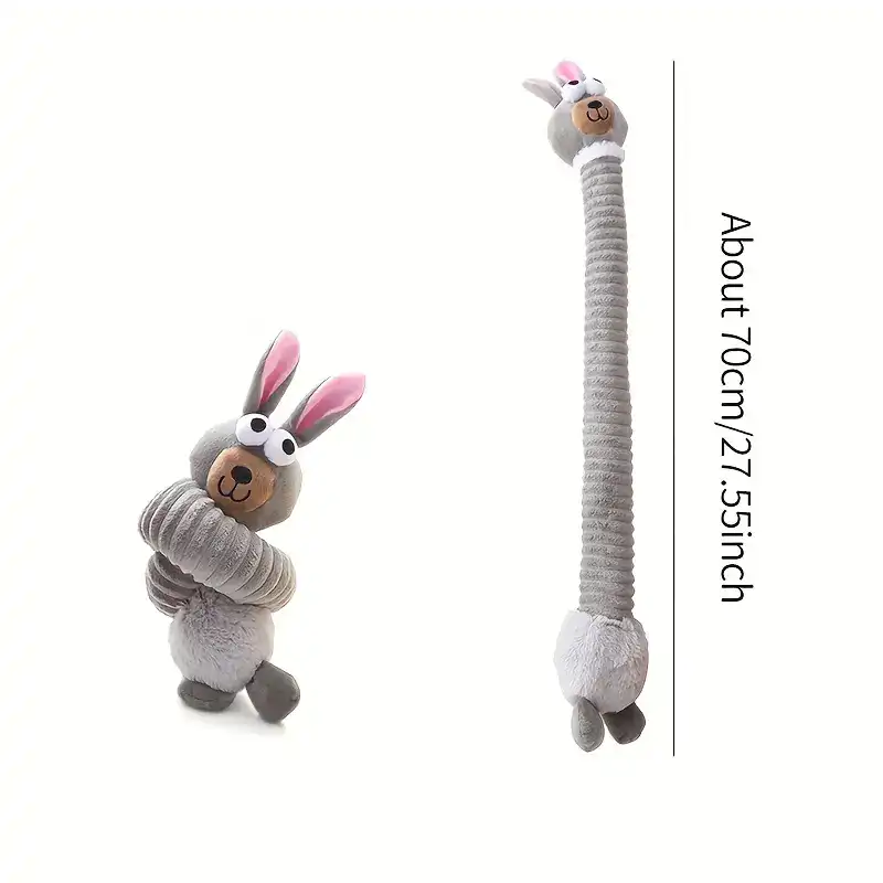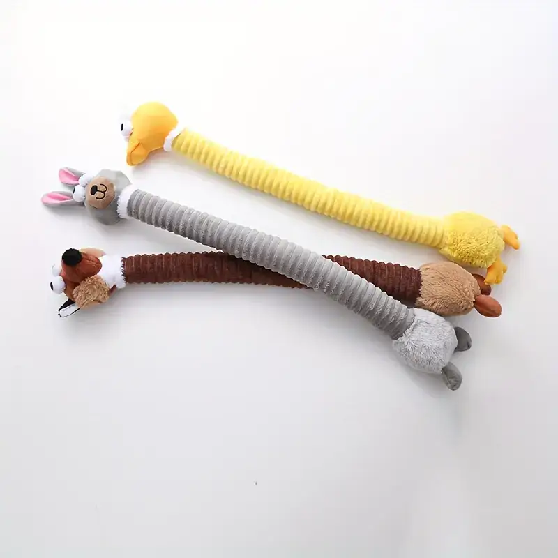 This plush dog toy is designed for chewing and interactive play. The long-neck animal shape provides an easy-to-grip form for carrying and tugging. A built-in squeaker adds sound feedback during play. The soft outer material is intended for everyday handling and supervised use.