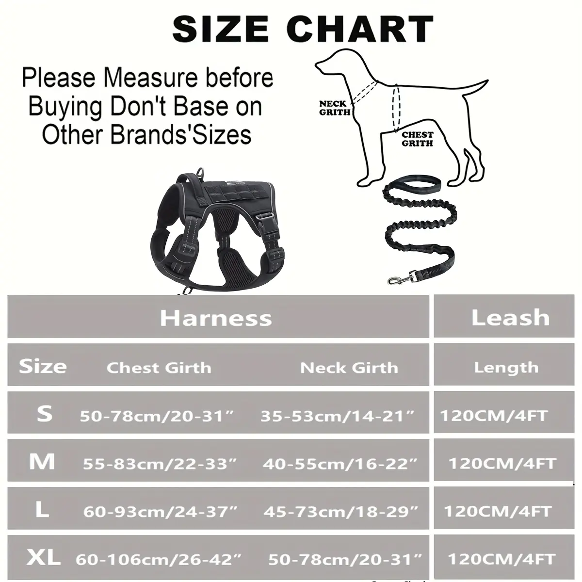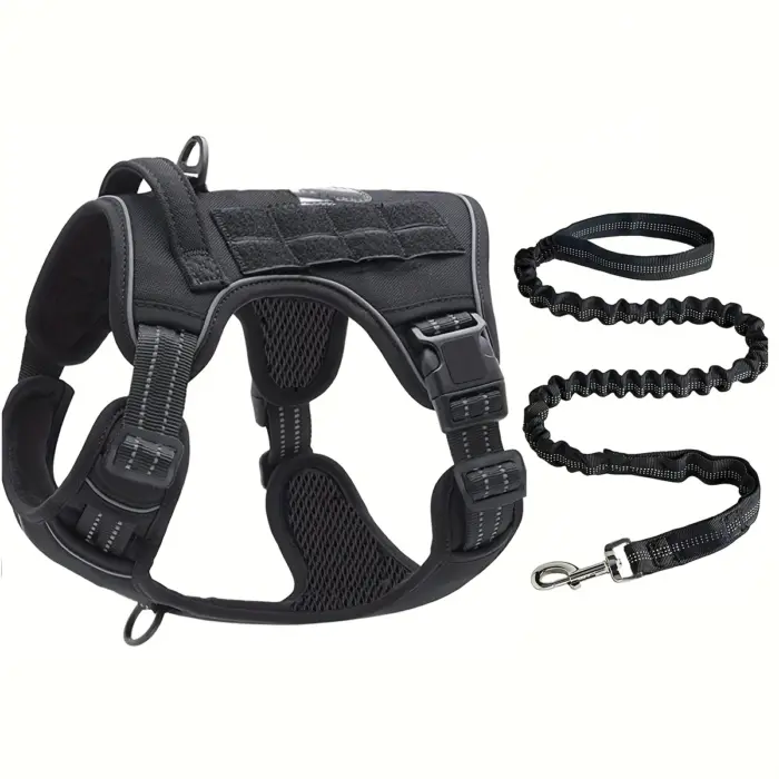This dog harness is designed to help provide controlled handling during walks and other on-leash activities. The adjustable strap layout is intended to support a more secure fit on medium to large dogs. An integrated top handle provides an additional grip point for short-range guidance. The bungee-style leash section is designed to add flexibility during movement. Hardware components use a metal clip connection for attaching the leash.
