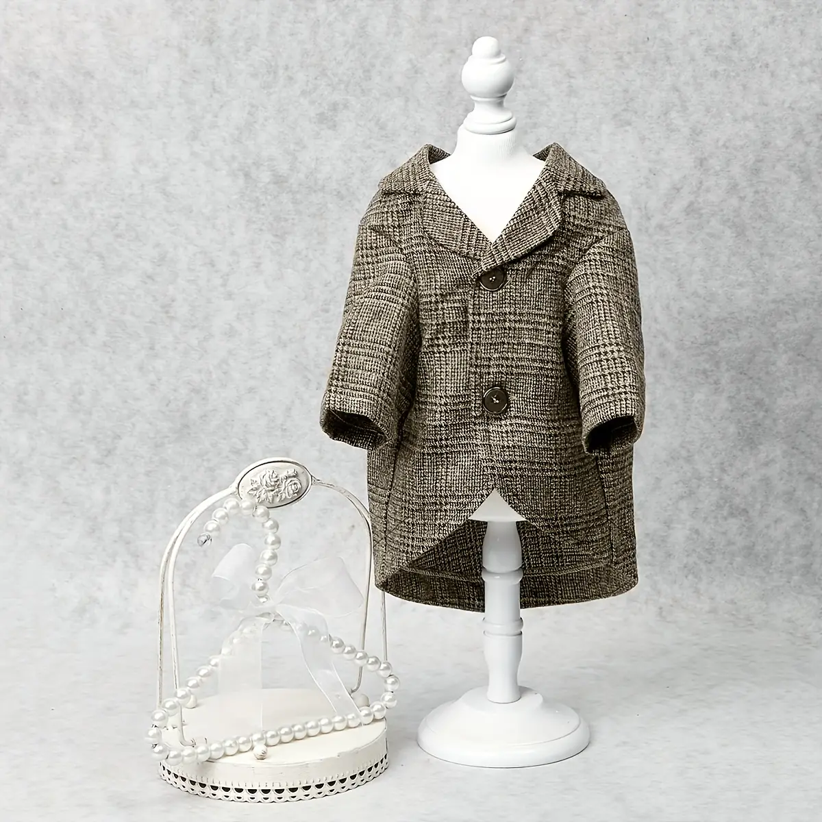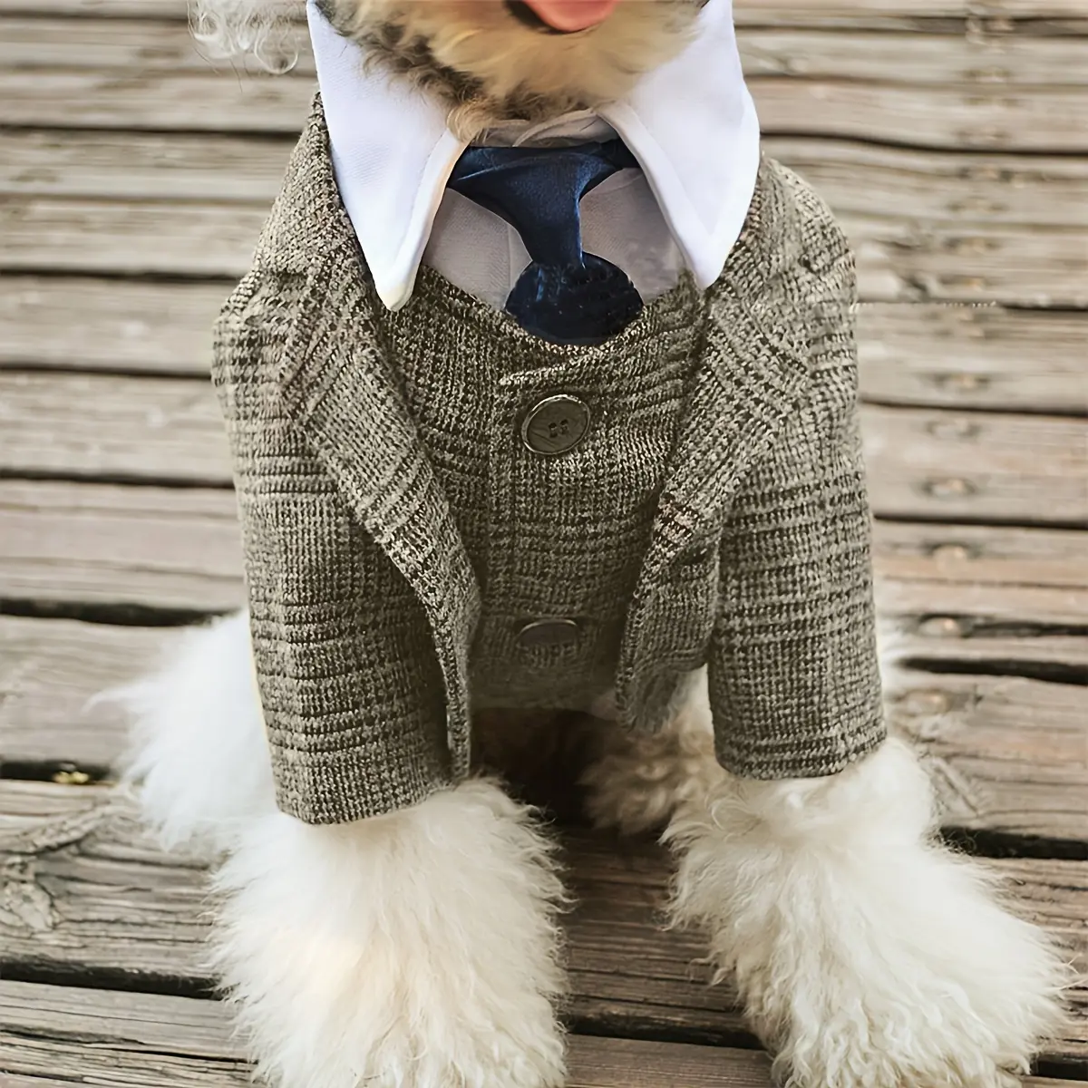 This pet suit is designed for special occasion wear and photo-ready styling. The khaki-colored outfit provides a structured look while allowing basic movement. It is intended to be worn over a pet’s body with a simple on-and-off design. Use as a clothing layer when a dressed-up appearance is needed.