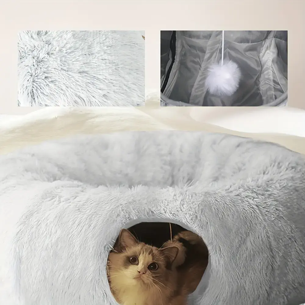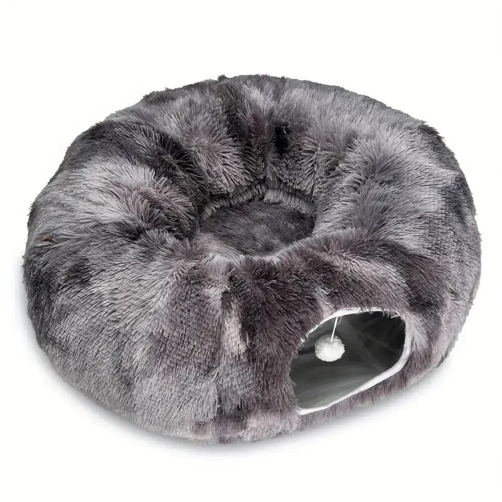This plush cat tunnel bed combines a resting area with a tunnel-style space for indoor play. The enclosed design creates a covered hideaway with an opening for easy entry and visibility. A soft, padded structure provides a warm surface for lounging. The bottom is designed to stay in place on indoor floor surfaces. Use as a single pet bed that also supports interactive movement through the tunnel.
