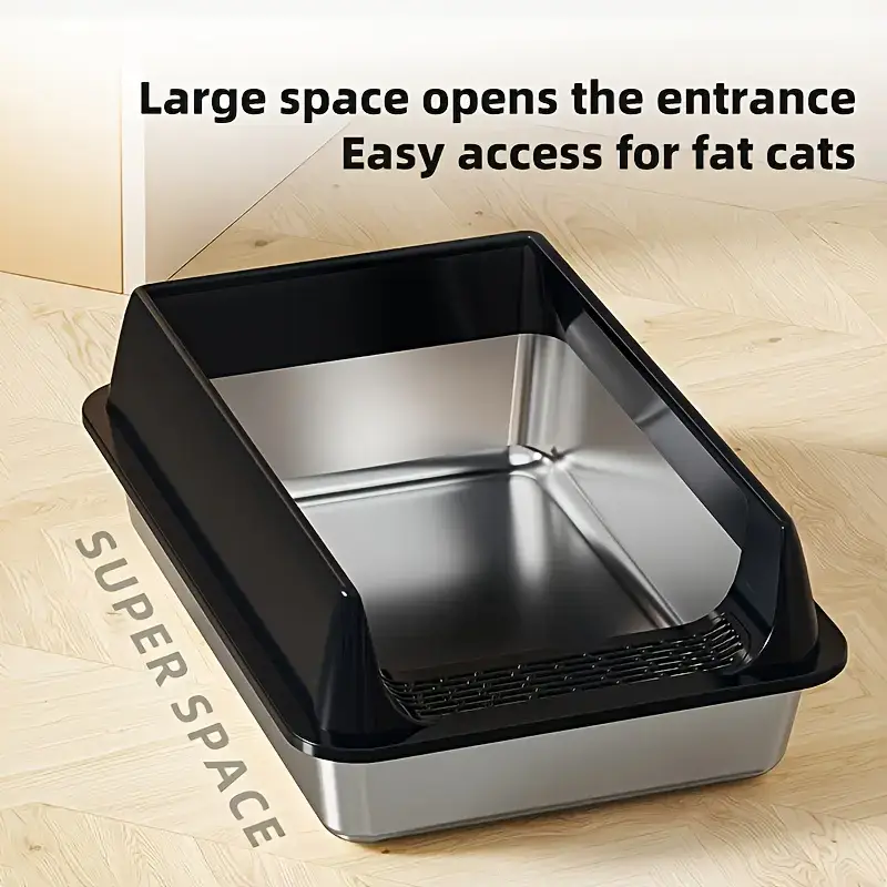 This semi-closed cat litter box is designed to help contain litter scatter during daily use. The stainless steel construction provides a rigid, non-porous surface that can be wiped down as needed. A semi-enclosed profile helps reduce tracking while keeping an accessible entry for cats. Includes a matching scoop for routine litter handling and cleanup.