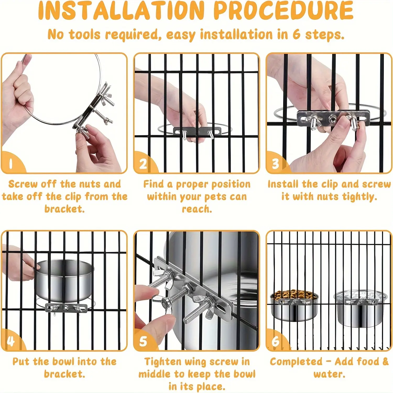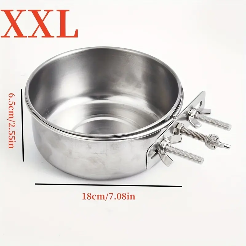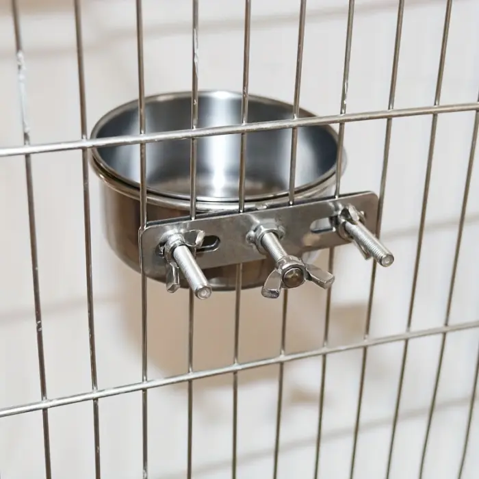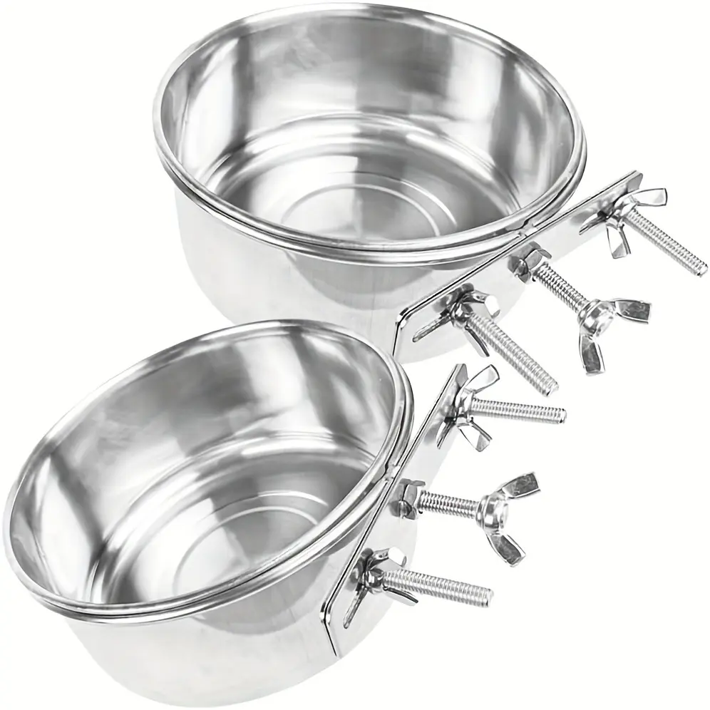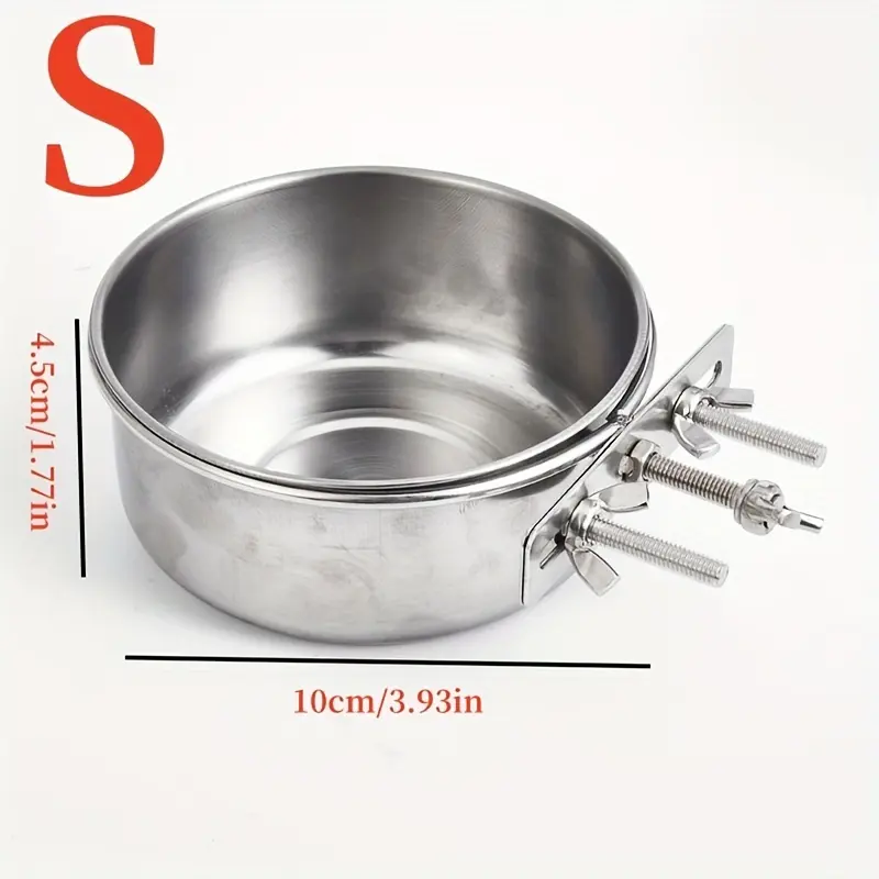 This stainless steel pet bowl is designed for holding food or water in a contained feeding setup. The metal bowl construction supports routine rinsing and wiping between uses. Hanging straps and screw-mount hardware are included to help secure the bowl in place. The open bowl shape provides easy access for filling and cleaning.