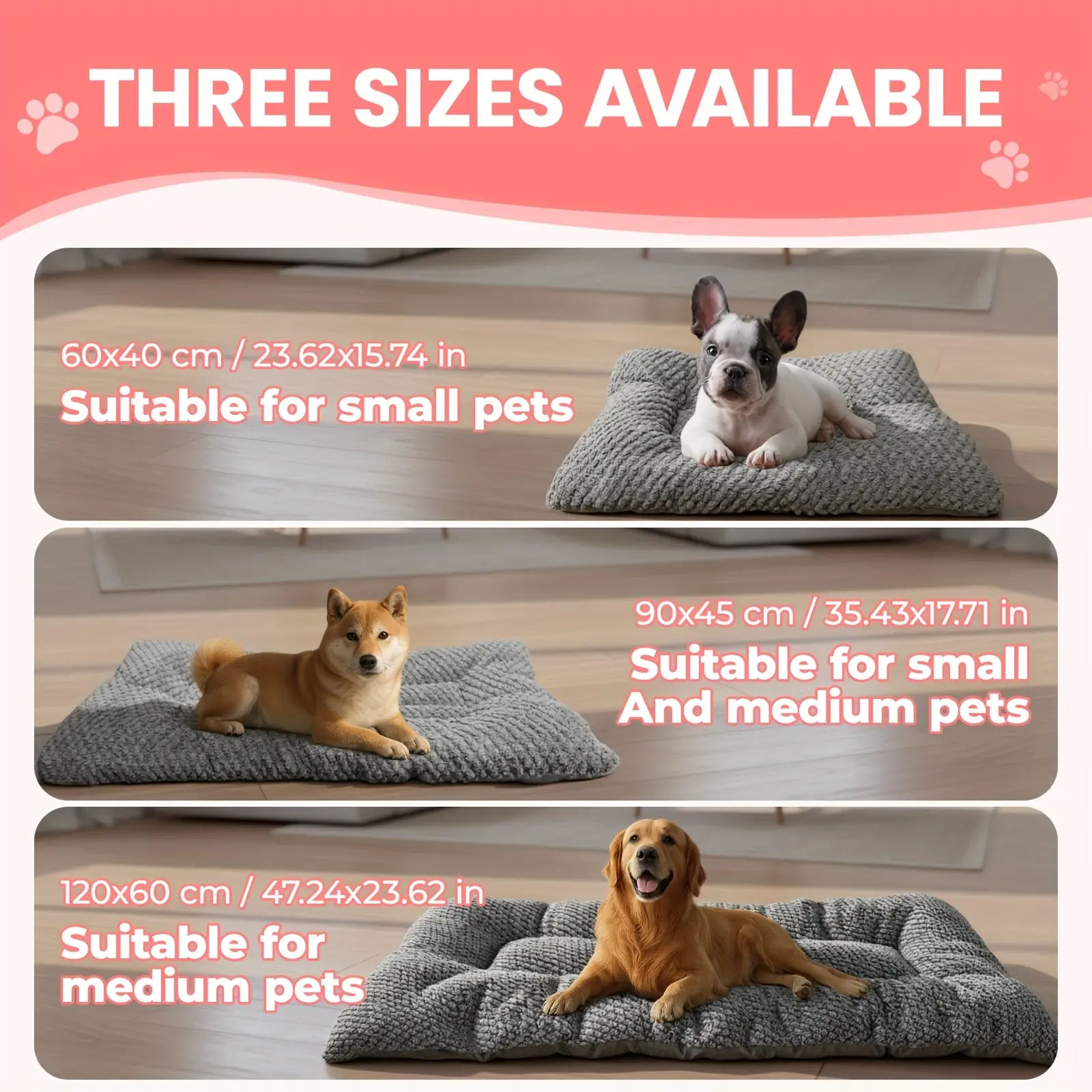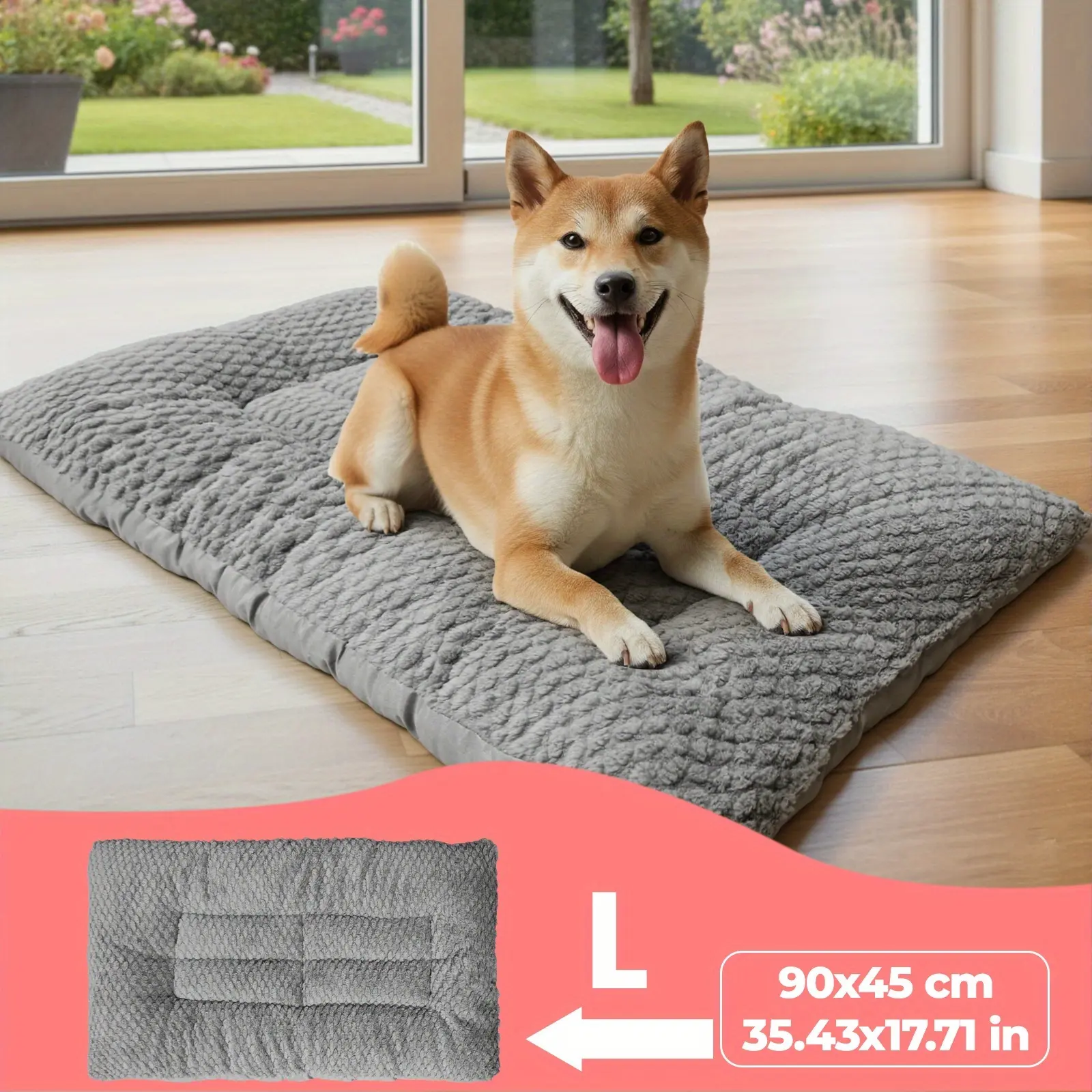 This plush crate pad is designed to provide a cushioned resting surface for dogs and cats. The thickened polyester fill helps create a supportive, padded feel for everyday use. Raised edges add a defined perimeter that can be used as a head or neck rest. The rectangular shape fits a range of pet resting areas and can be flipped for reversible use.