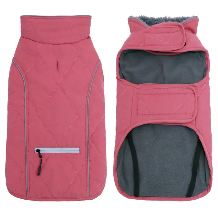 This winter dog coat is designed for cold-weather wear during outdoor activity. The lamb fleece lining helps provide a warm feel while the outer layer adds a protective cover. An adjustable fit helps keep the coat positioned during movement. Reflective trim is included for added visibility in low-light conditions. Pockets provide a small storage area for lightweight items.